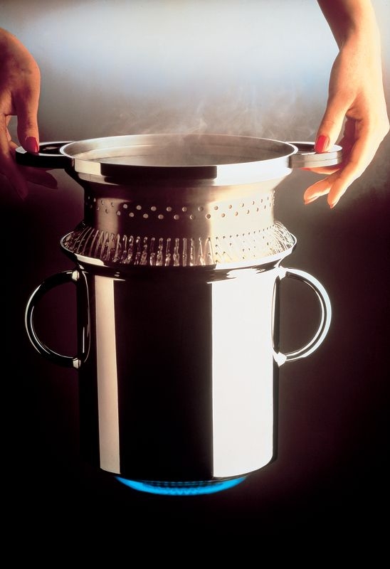 Pasta-Set aus Edelstahl 18/10 mit Magnetboden. Das Pasta-Set stellt einen der seltenen Fälle dar, in denen uns eine echte Innovation in dem sehr alten Bereich der Kochgerätschaften gelungen ist: das Nudelsieb im Topf. Die Form dieses Objekts war so faszinierend und rätselhaft, dass wir eine Marktstudie starteten. Ungefähr die Hälfte aller Befragten konnten in dem Objekt keinen Kochtopf erkennen und stellten die unterschiedlichsten Vermutungen an. Trotzdem beschlossen wir, mit der Produktion zu beginnen und haben gut daran getan. Das Pasta-Set ist so populär geworden, dass es den Markt beeinflusst hat und 1986 auf der Bio 11 in Ljubljana mit der Goldmedaille ausgezeichnet wurde. Weltweit wurde es mindestens hundertmal kopiert.