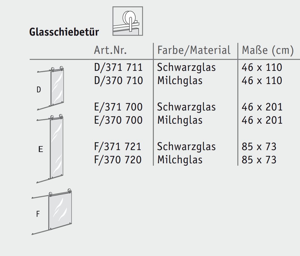 Glasschiebetür in Milchglas Breite 46 cm und Höhe 201 cm Glasschiebetüren für BIII 380, BIII 250, GARBO und MICRO Glasschiebetür in Milchglas Breite 46 cm und Höhe 201 cm Regal MICRO Glasschiebetür in Schwarzglas Breite 46 cm und Höhe 110 cm Details vom Designer Schiebetürenbeschlag Chrom Glasschiebetüren für BIII 380, BIII 250, GARBO und MICRO